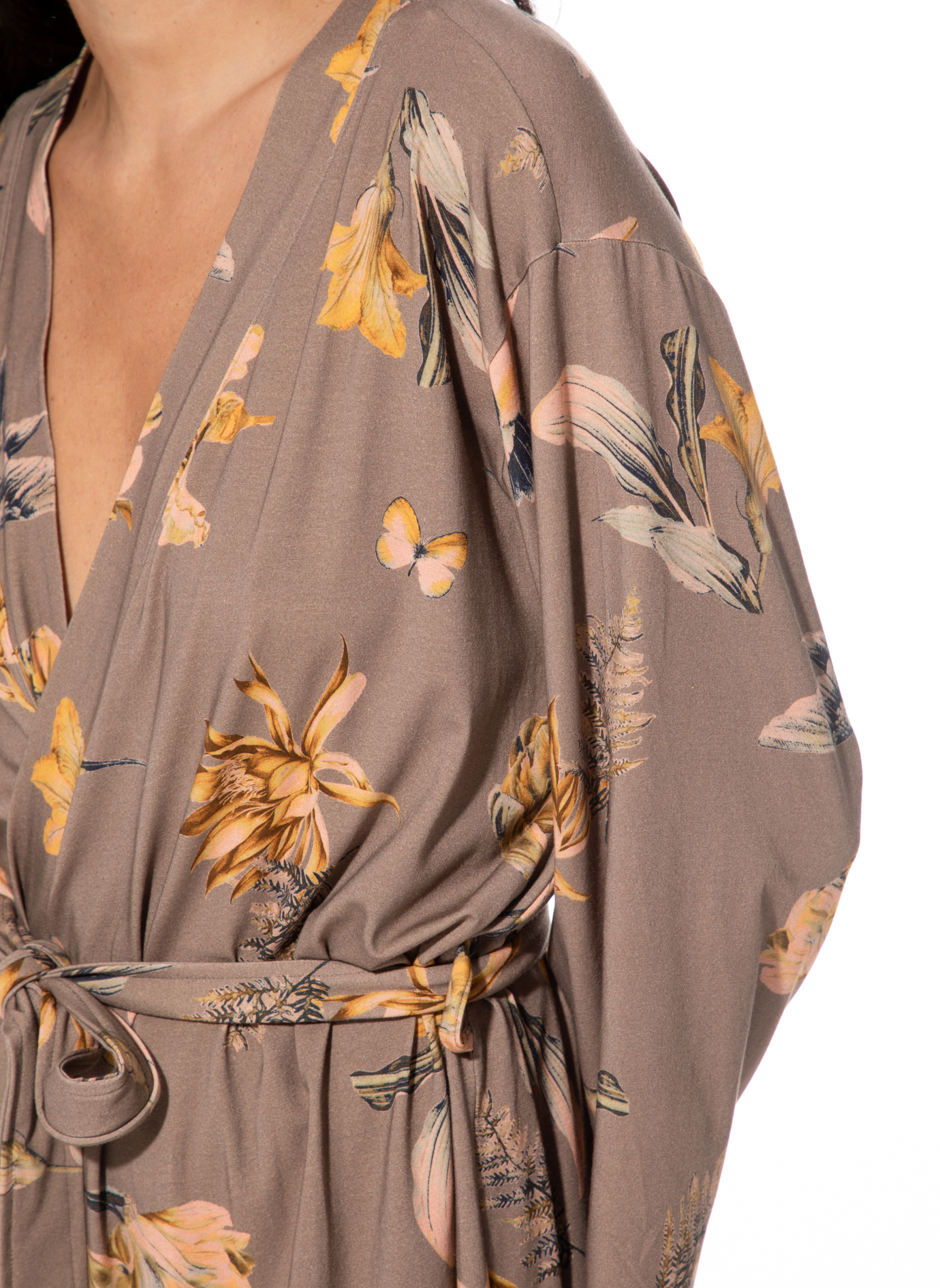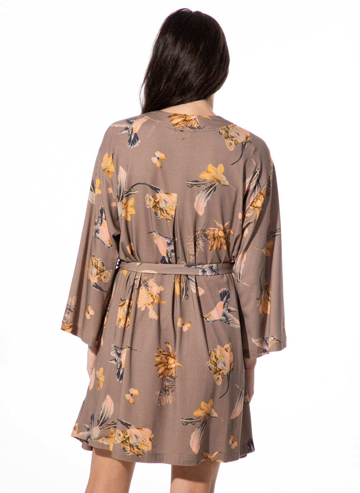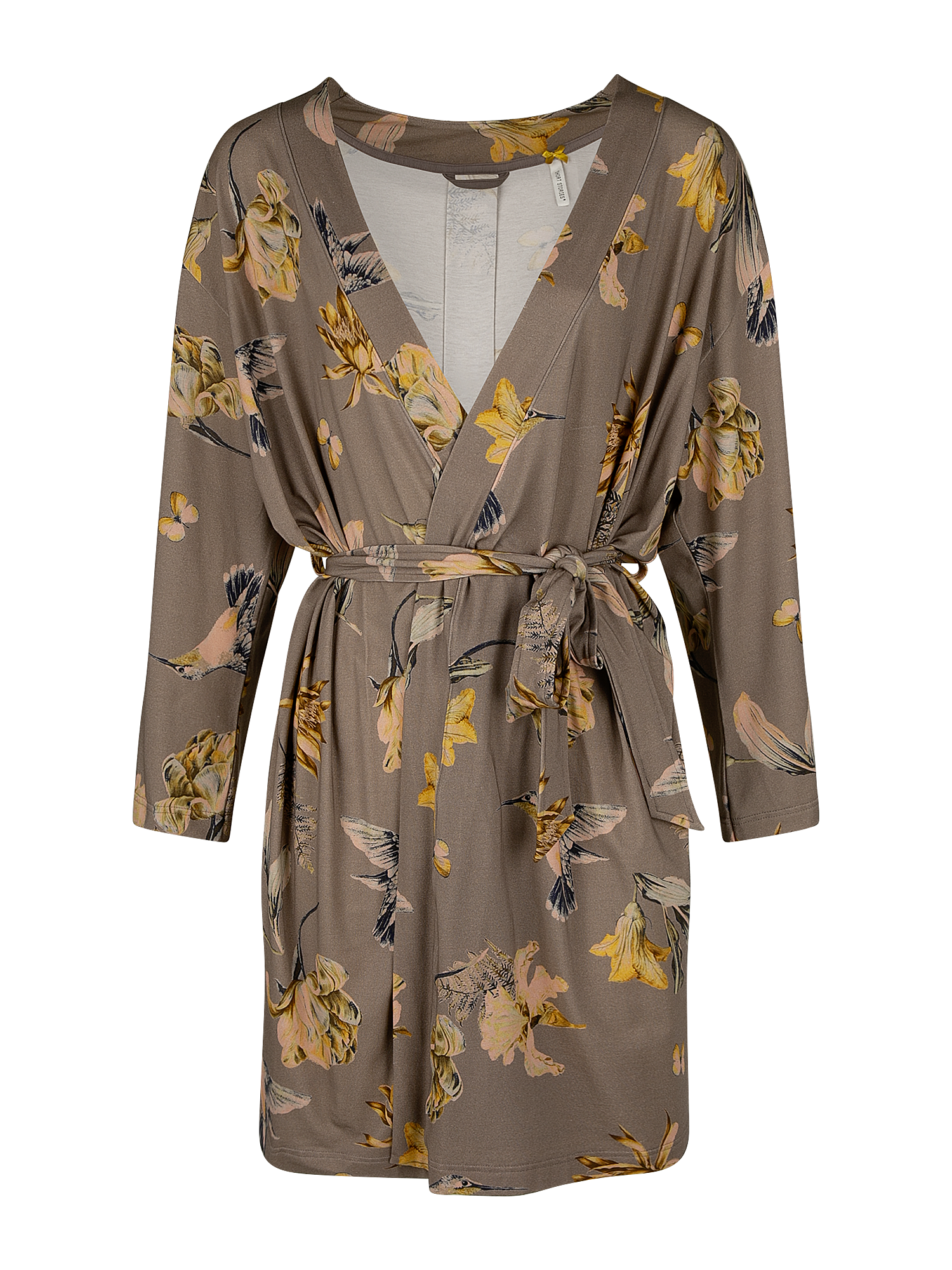 Der Damen-Morgenmantel von SHORT STORIES in 7/8-Länge verwöhnt mit einem weichen, elastischen Materialmix aus 47 % Baumwolle, 47 % Modal und Elasthan. Der locker geschnittene Mantel mit langen Ärmeln lässt sich vorne bequem wickeln und mit dem Bindegürtel auf Taillenhöhe individuell anpassen. Das Allover-Design in warmem Braun mit floralen Mustern und zarten Kolibris in Gelb- und Rosatönen verleiht dem Mantel eine elegante, feminine Note. Ein komfortabler Begleiter für gemütliche Morgenstunden oder entspannte Loungewear-Momente.