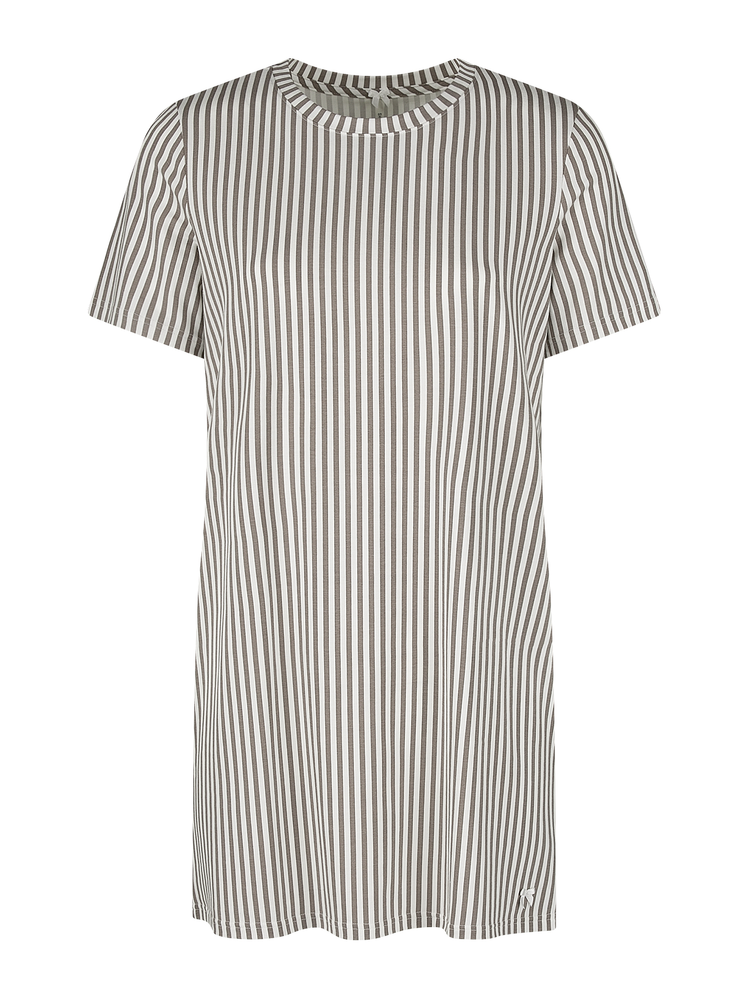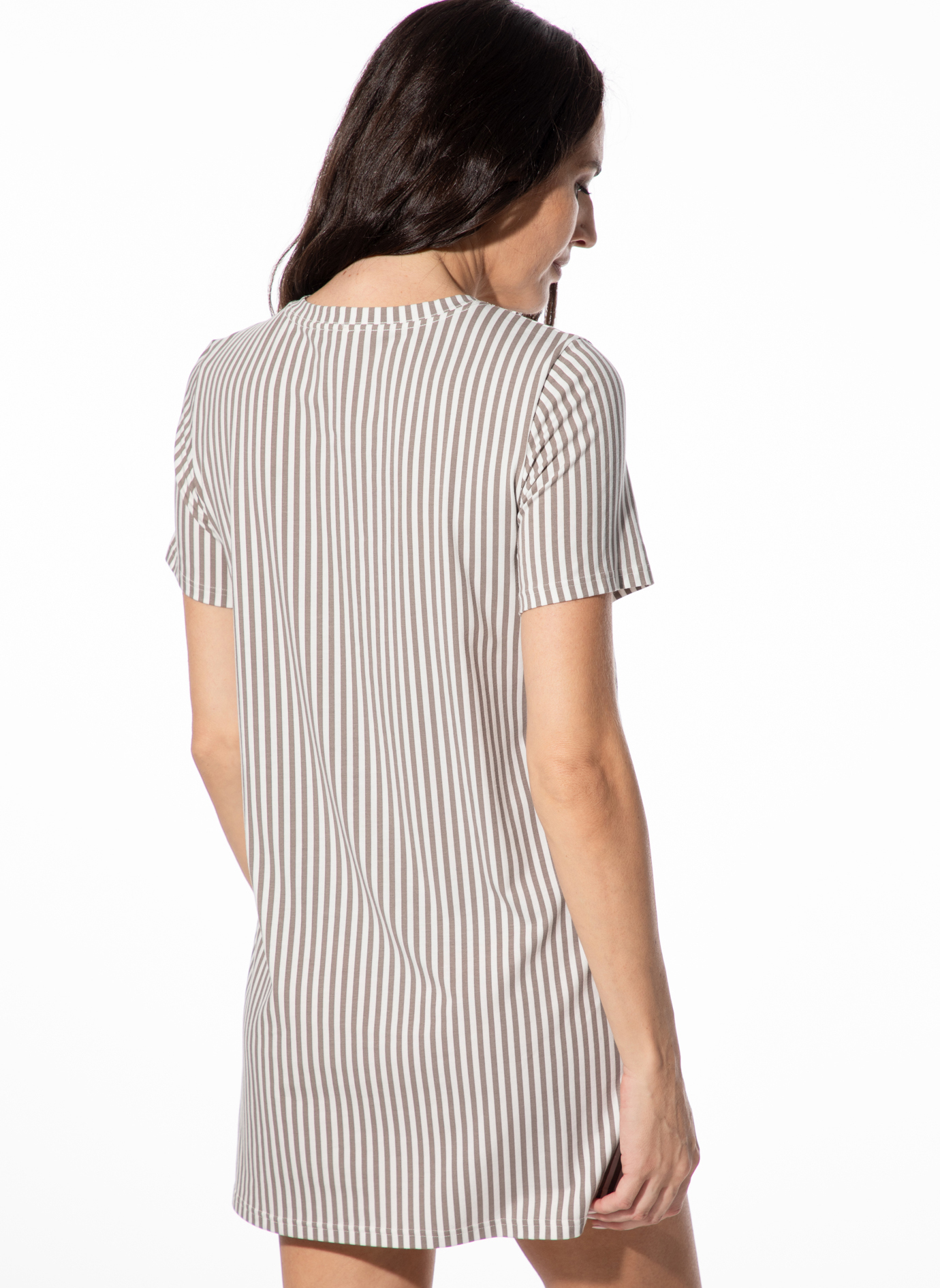 Das Damen-Nachthemd von SHORT STORIES besteht aus einem weichen, elastischen Materialmix aus 47 % Baumwolle, 47 % Modal und 6 % Elasthan und fühlt sich angenehm auf der Haut an. Die Ärmel sind etwas länger geschnitten, der gerade, locker fallende Schnitt mit klassischem Rundhalsausschnitt sorgt für komfortables Tragen. Das Design zeigt einen modernen, zeitlos-eleganten Streifenprint in warmem Braun und, während links am Saum eine kleine Schleife als feminines Detail gesetzt ist. Das Nachthemd verbindet hohen Komfort mit stilvoller Optik für entspannte Nächte.