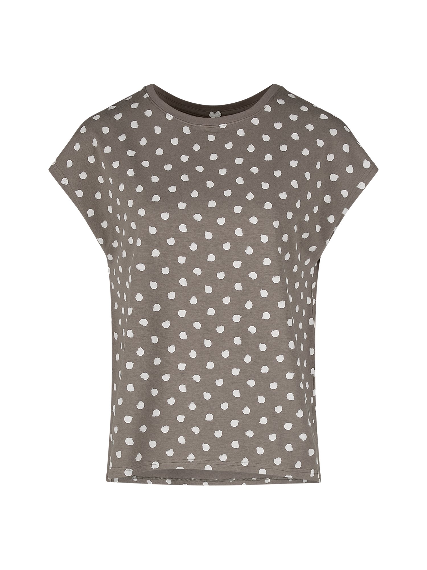 Das Damen-Schlafshirt mit kurzen Cap Sleeves von SHORT STORIES zeigt sich im modernen Braunton mit verspieltem Allover-Punkteprint. Die lockere, gerade Schnittform bietet viel Bewegungsfreiheit und sorgt für ein entspanntes Tragegefühl die ganze Nacht über. Die weiche Single-Jersey-Qualität aus 95 % Baumwolle und 5 % Elasthan schmiegt sich angenehm an die Haut an und bleibt dabei formstabil sowie atmungsaktiv. Ein klassisch eingefasster Rundhalsausschnitt rundet den lässigen Look ab. Ein vielseitiges Schlafshirt, das sich ideal mit vielen Hosen aus der Kollektion kombinieren lässt.