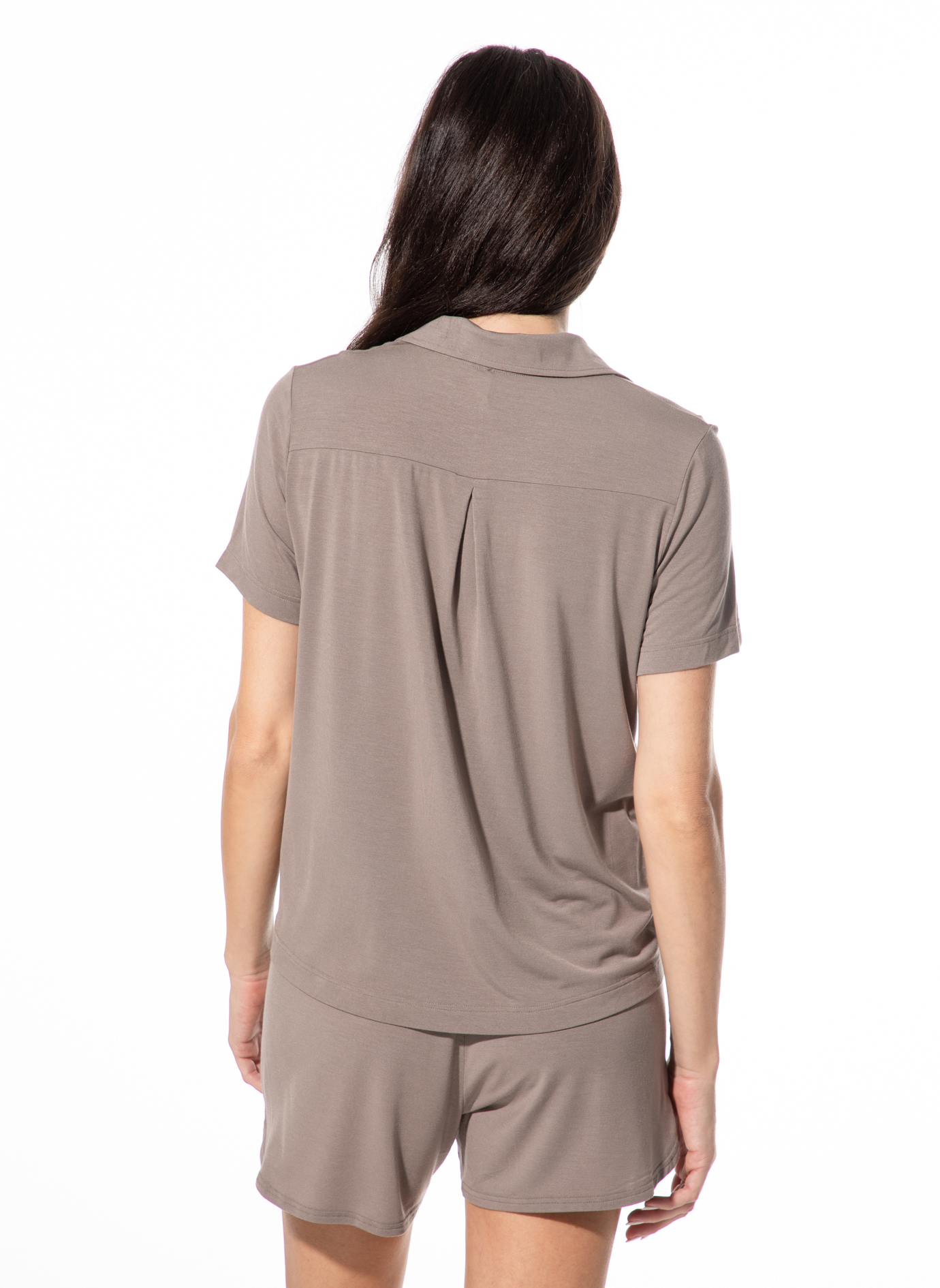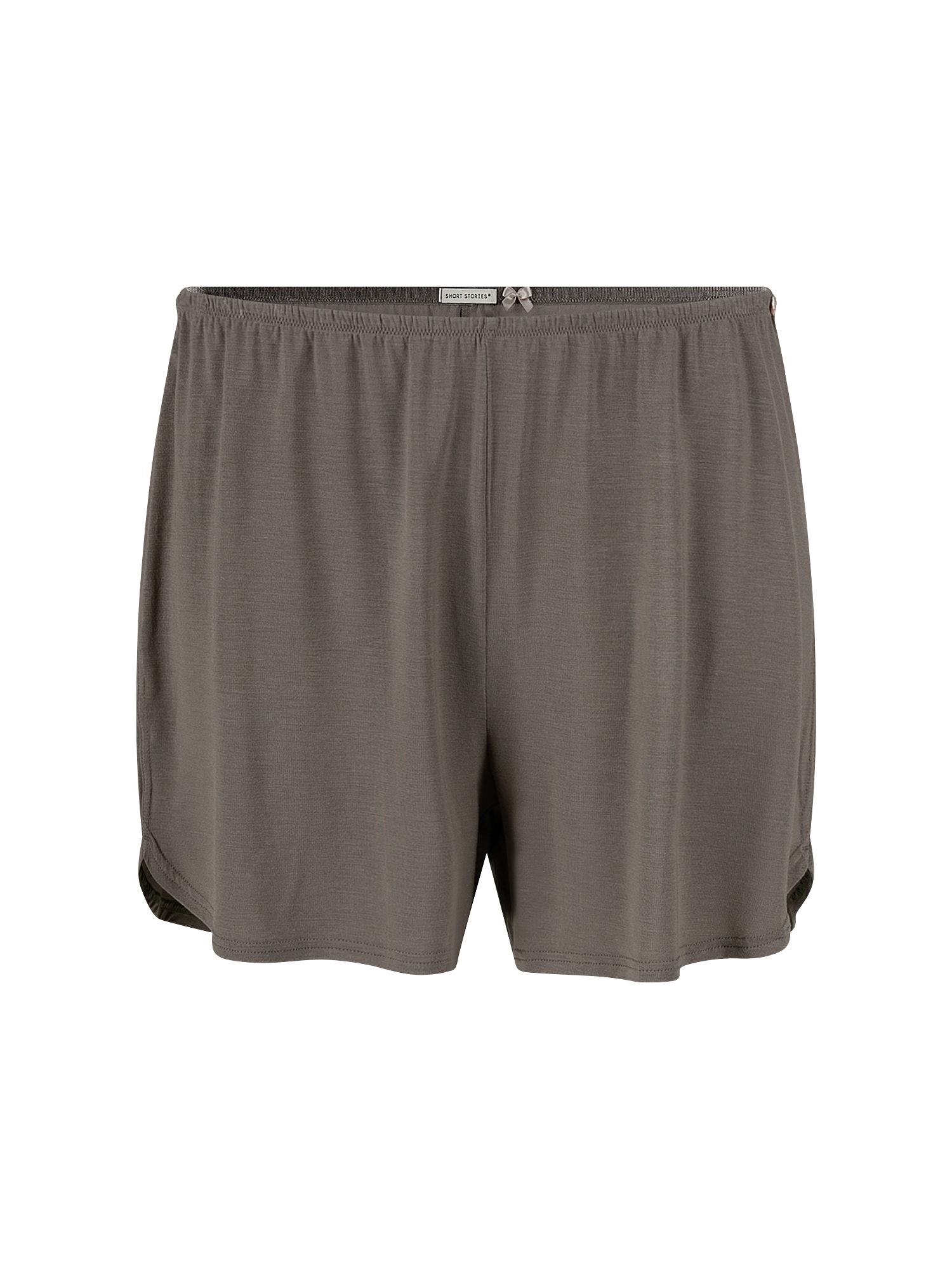 Die Damen-Shorts von SHORT STORIES bestehen aus weichem, vollplattiertem Single Jersey (95 % Modal, 5 % Elasthan) in warmem Braun und schmiegen sich angenehm an die Haut. Der elastische Bund sorgt für flexiblen, bequemen Sitz, während abgerundete Saumschlitze einen sportlich-modernen Akzent setzen. Das besonders glatte, anschmiegsame Material bietet hohen Tragekomfort und macht die Shorts vielseitig einsetzbar – für entspannte Nächte oder als lässiges Homewear-Oberteil. Ein komfortables Lieblingsstück, das Style und Wohlfühlen gekonnt verbindet.